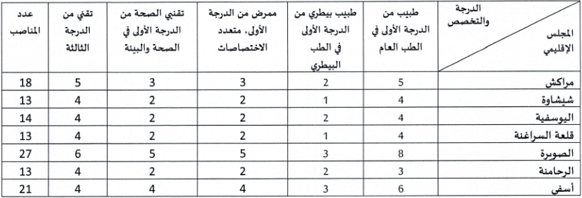 • المجلس الإقليمي مراكش (مجموع المناصب 18): 5 طبيب من الدرجة الأولى، 2 طبيب بيطري، 3 ممرض، 3 تقني صحة، 5 تقني من الدرجة الثالثة.