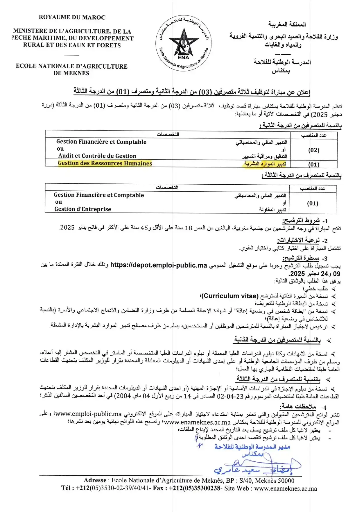 Avis de concours de recrutement ENA Meknès 2026