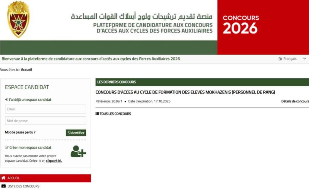 Les Inspections Générales des Forces Auxiliaires Zone Nord et Zone Sud organiseront du 14 novembre au 09 décembre 2025 un concours d’accès au cycle de formation des Elèves Mokhazenis – Masculins au titre de l’année 2026, dans la limite des postes budgétaires devenus vacantes et ceux crées au titre de l’année 2026, respectivement aux Centres de Formation des Personnels des Forces Auxiliaires Lamjaâra Province Ouezzane et Aoulouz Province Taroudannt.