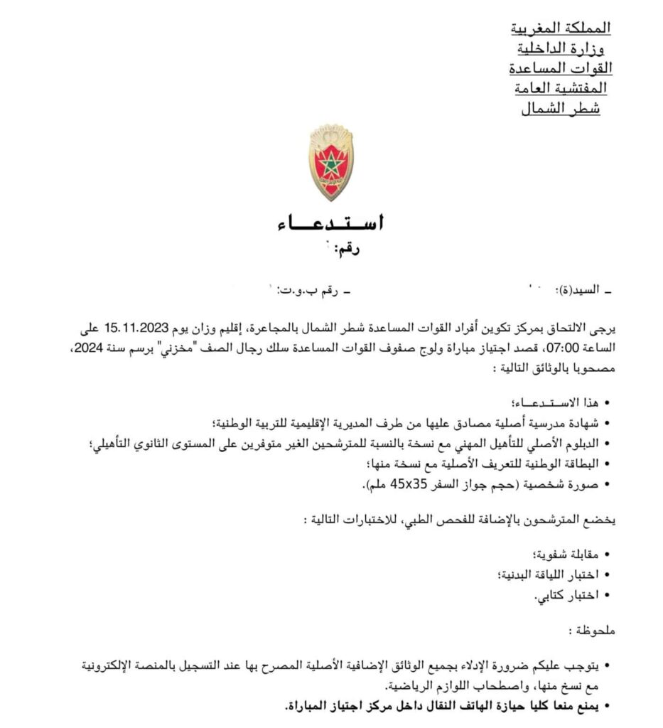 تنظم المفتشيتان السنةتان للقوات المساعدة شطري الجنوب والشمال من 14 نونبر 2025 لغاية 09 دجنبر 2025 مُباراة ولوج سلك رجال الصف بالقوات المساعدة من فئة الذكور رتبة “مخزني” برسم عام 2026 في حدود المناصب التي اصبحت شاغرة ، والمحدثة برسم السنة المالية 2026 ، تواليا بمركزي التدريب للقوات المساعدة بالمجاعرة إقليم وزان، و بأولوز إقليم تارودانت .