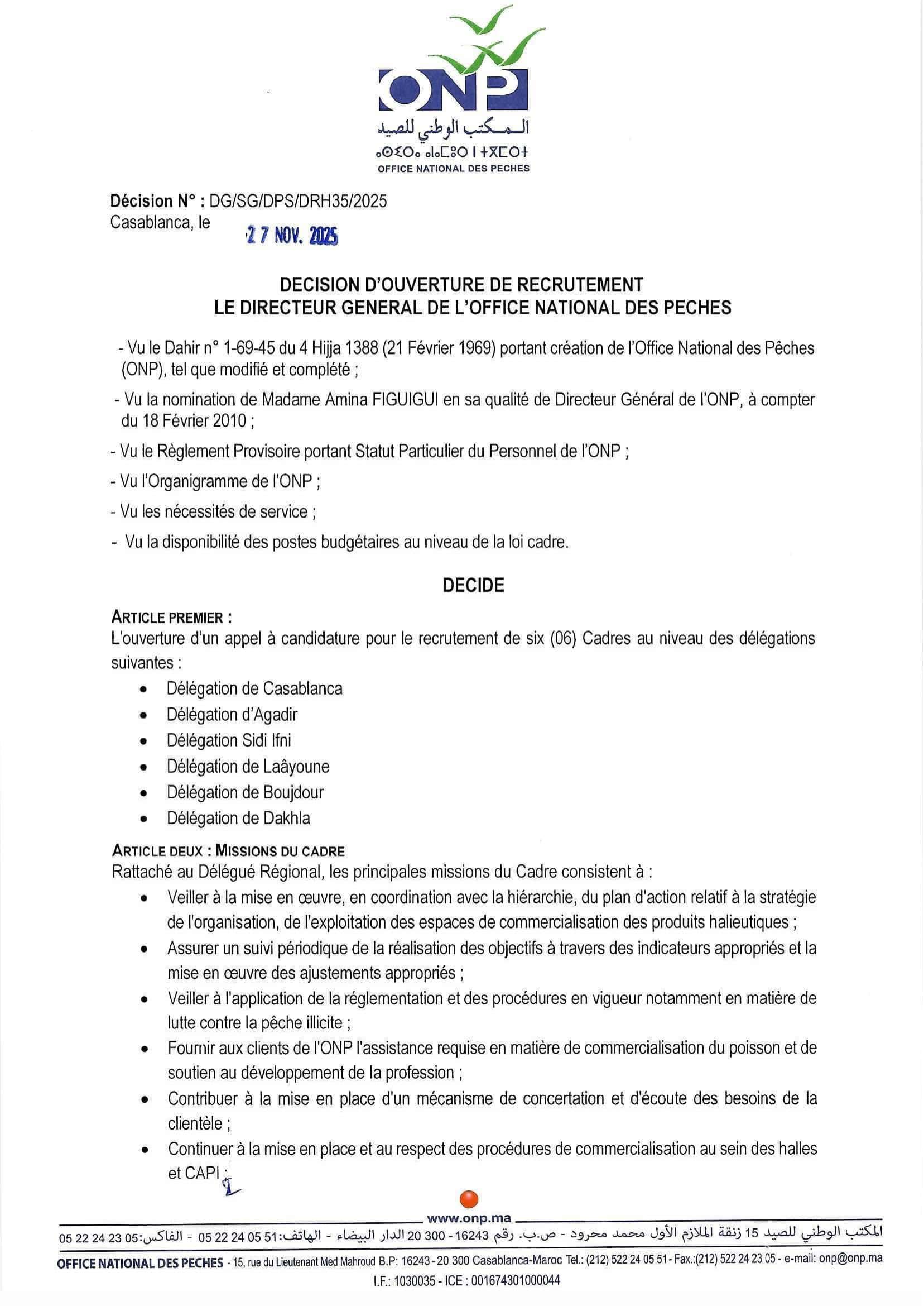 - يعلن المكتب الوطني للصيد (ONP) عن مسابقة لتوظيف 6 أطر في مختلف مندوبياته.