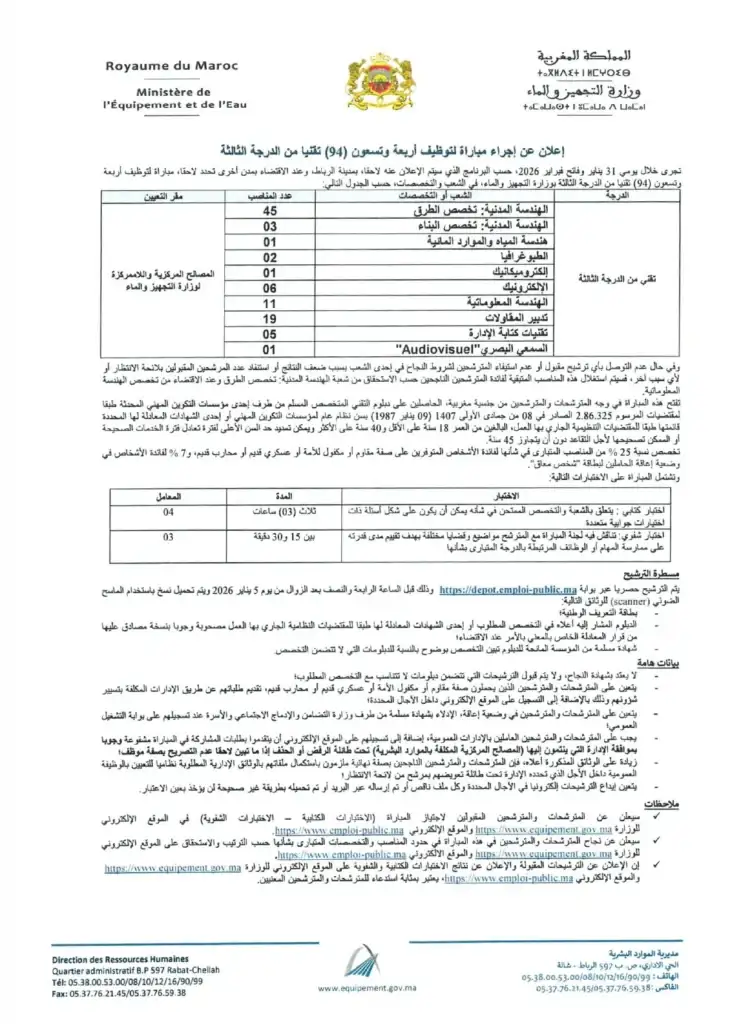 مباراة توظيف 94 تقني من الدرجة الثالثة بوزارة التجهيز والماء