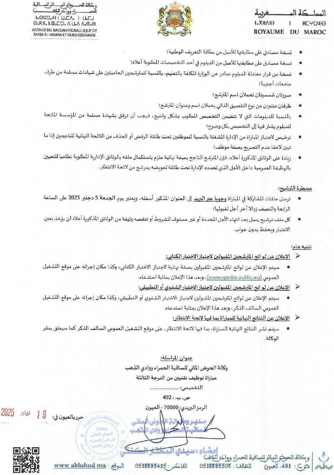 توظيف 6 تقنيين من الدرجة الثالثة و الرابعة بوكالة الحوض المائي للساقية الحمراء ووادي الذهب 2025